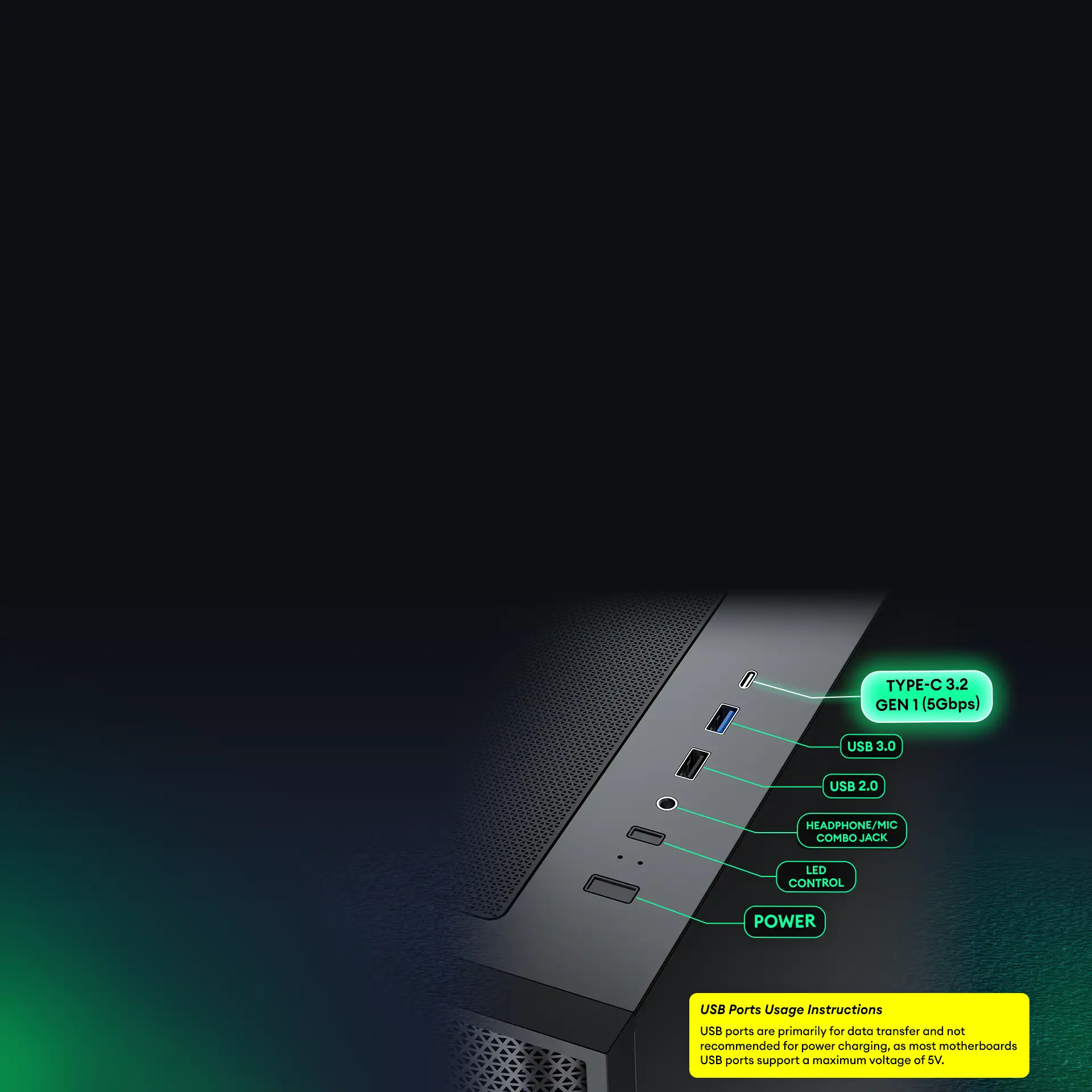 Power, Led, USB2.0 x 1, USB3.0 x 1, Type-C 3.2 Gen 1 (5Gbps) x 1, Headphone/Mic Combo Jack