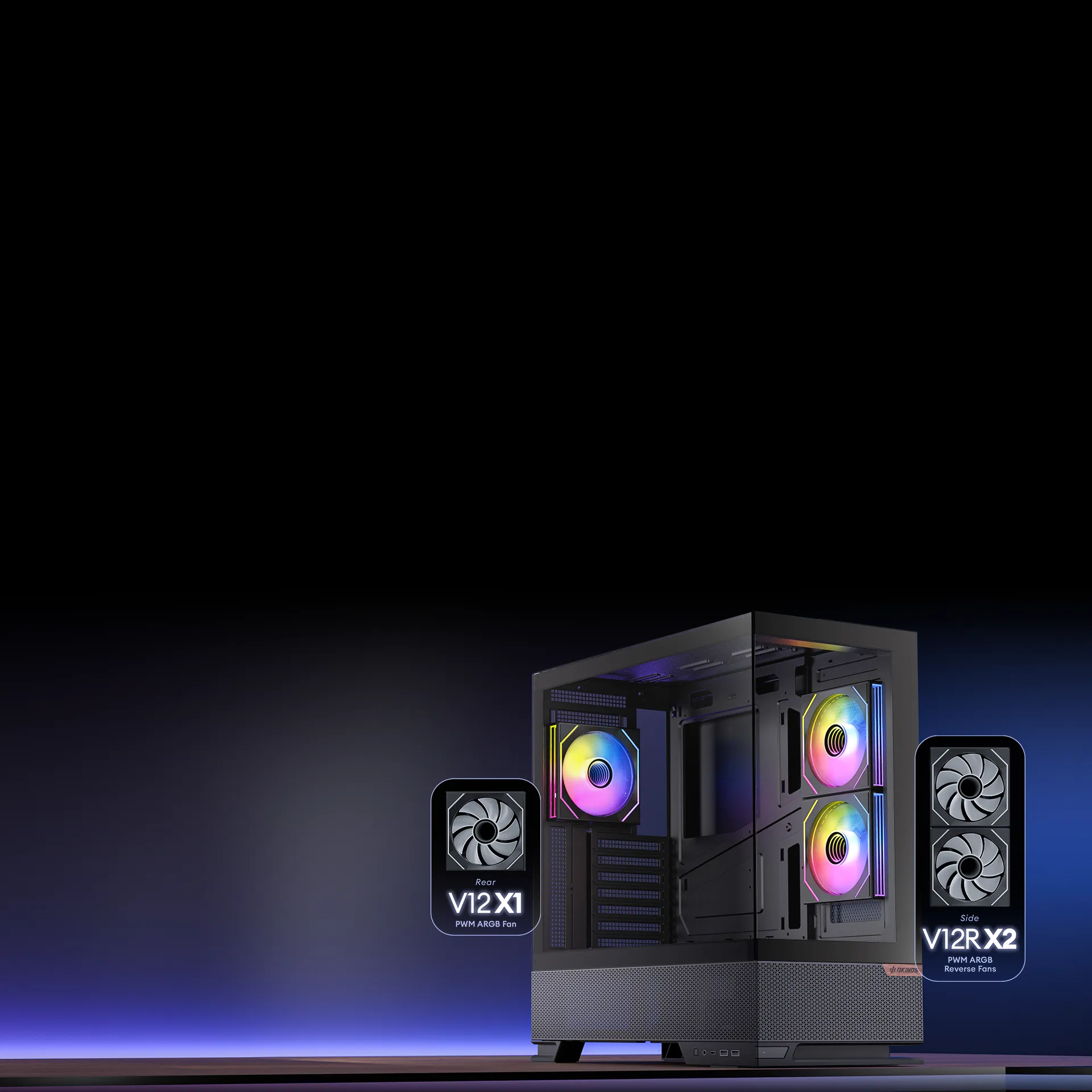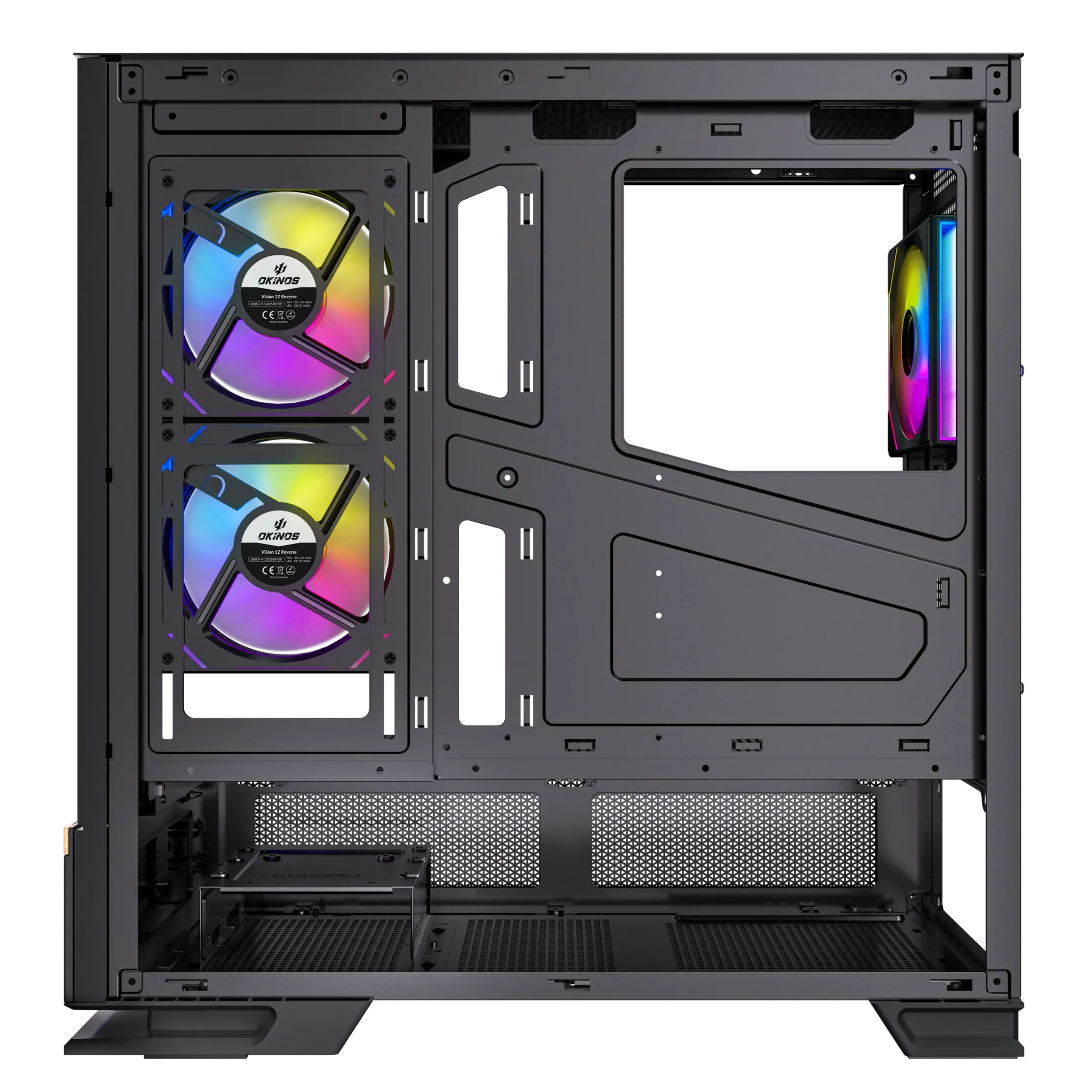 2 x 120mm V12R PWM ARGB Reverse Fans on the right hand side + 1 x 120mm V12 PWM ARGB Fan in the rear
