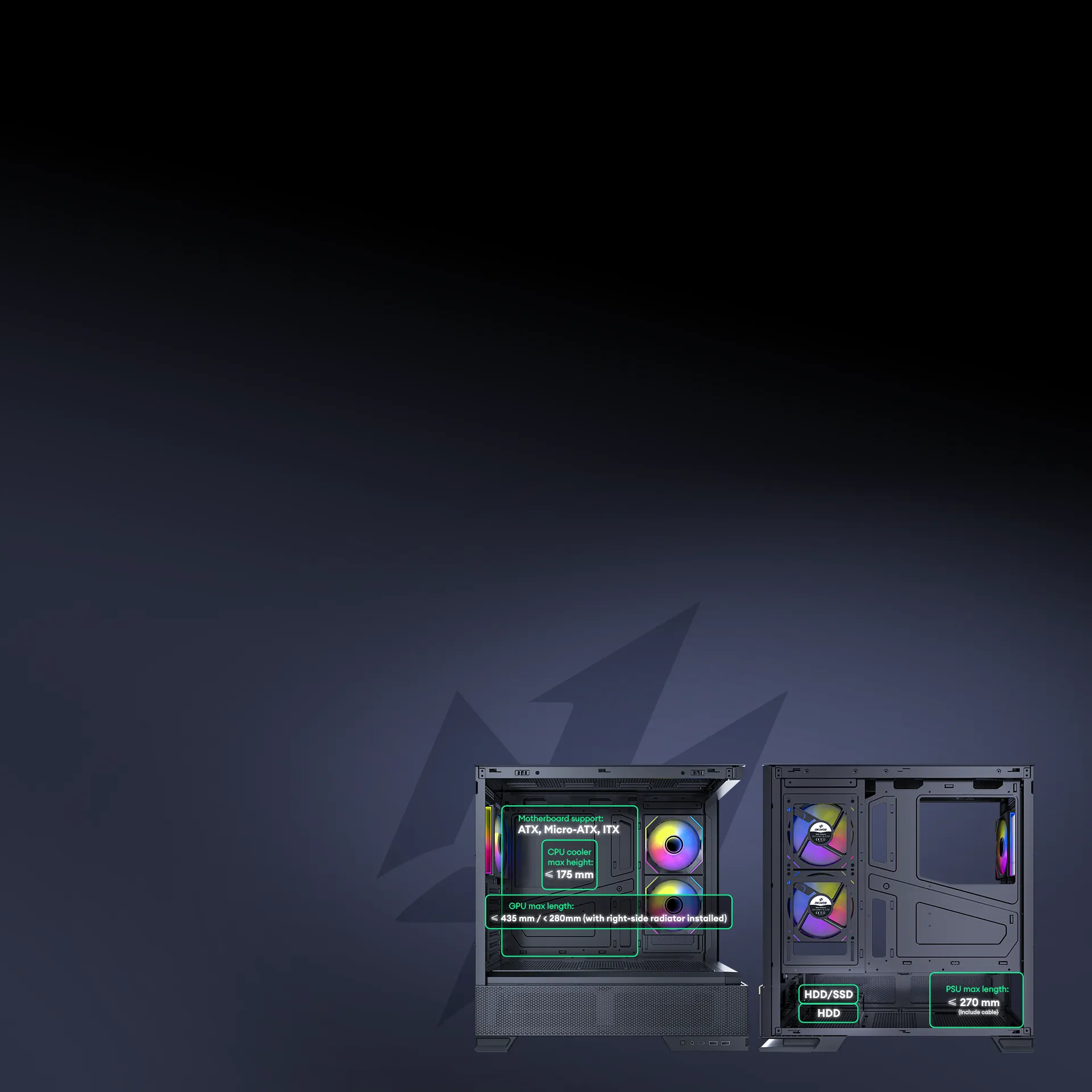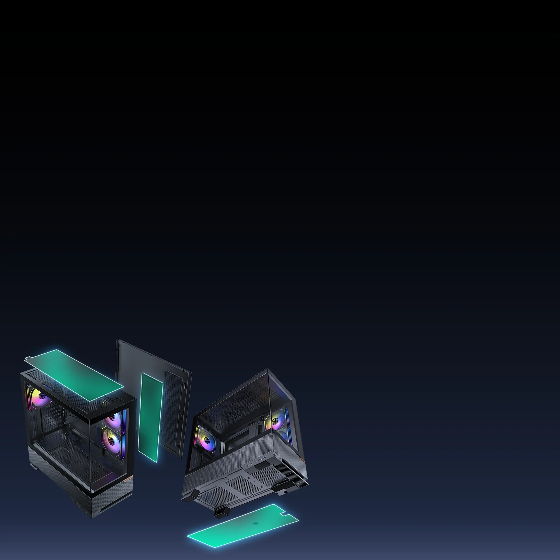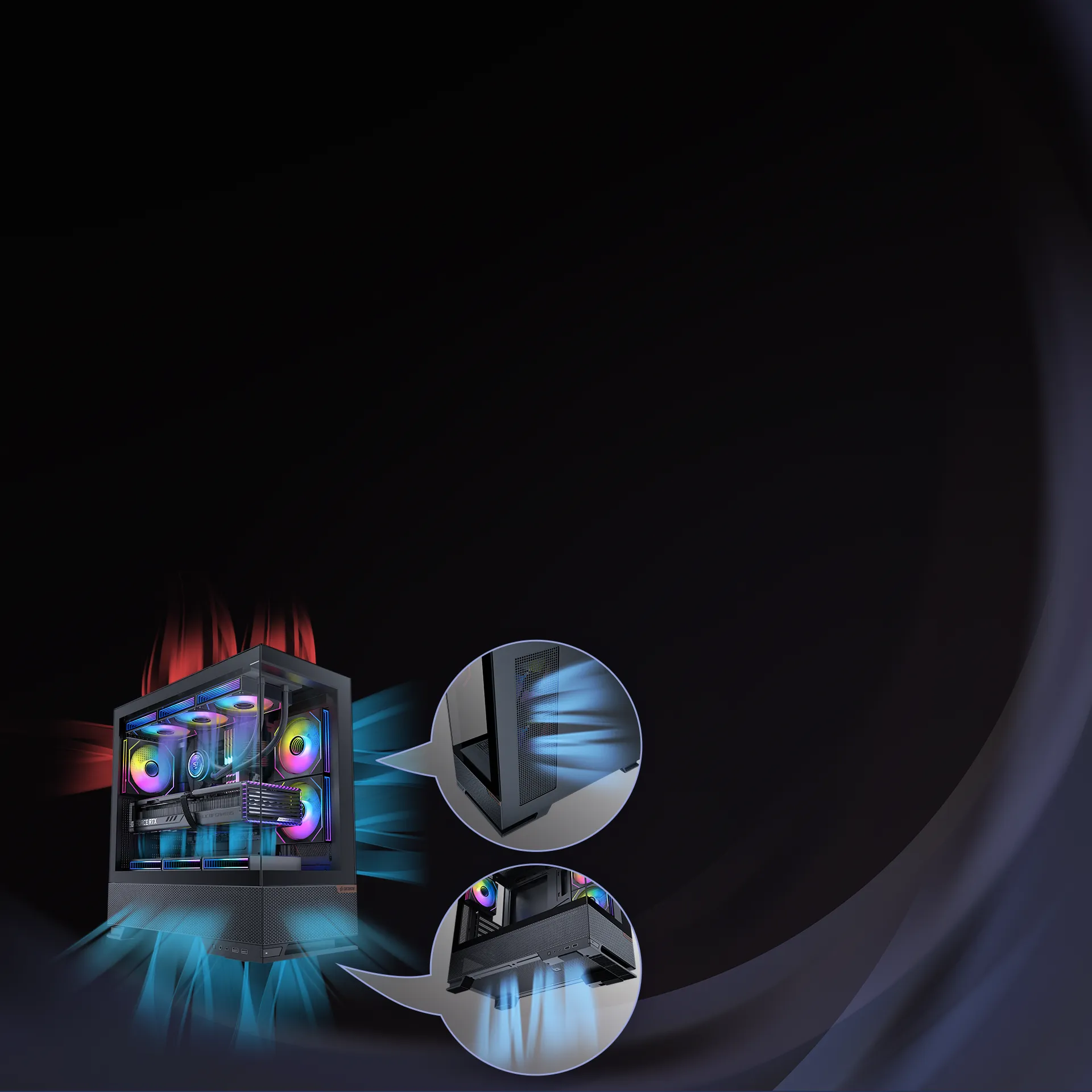 Accommodates up to 9 fans to deliver powerful airflow and maintain a stable system environment. Multi-zone mesh vents maximize cooling efficiency and airflow performance.