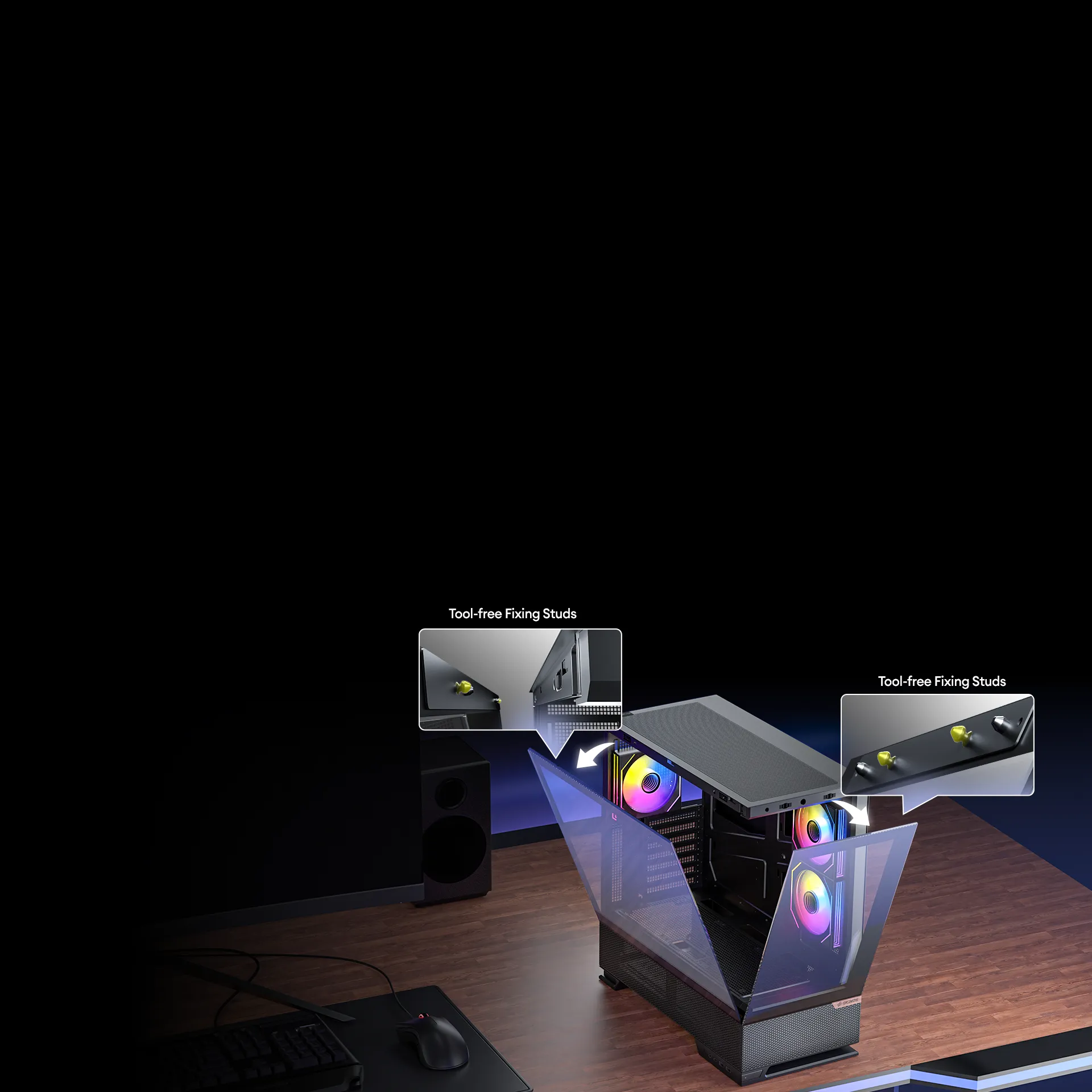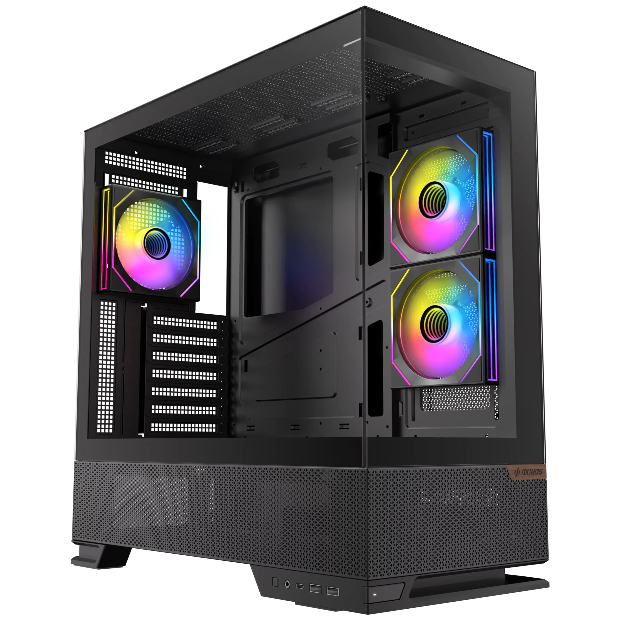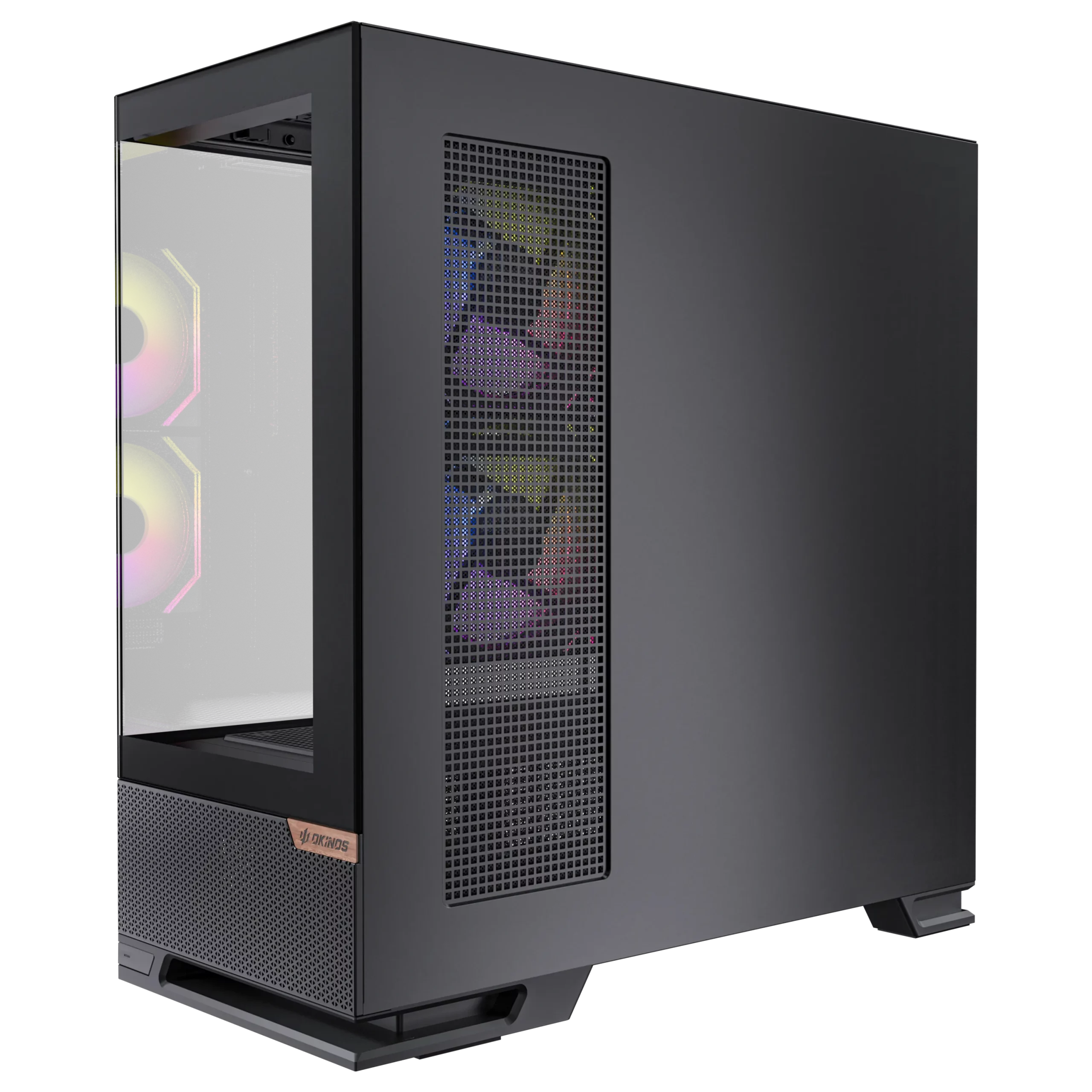 - Panoramic 270° view design with a floating case stand and a walnut wood badge on the front, offering exceptional airflow and a refined fusion of modern elegance.