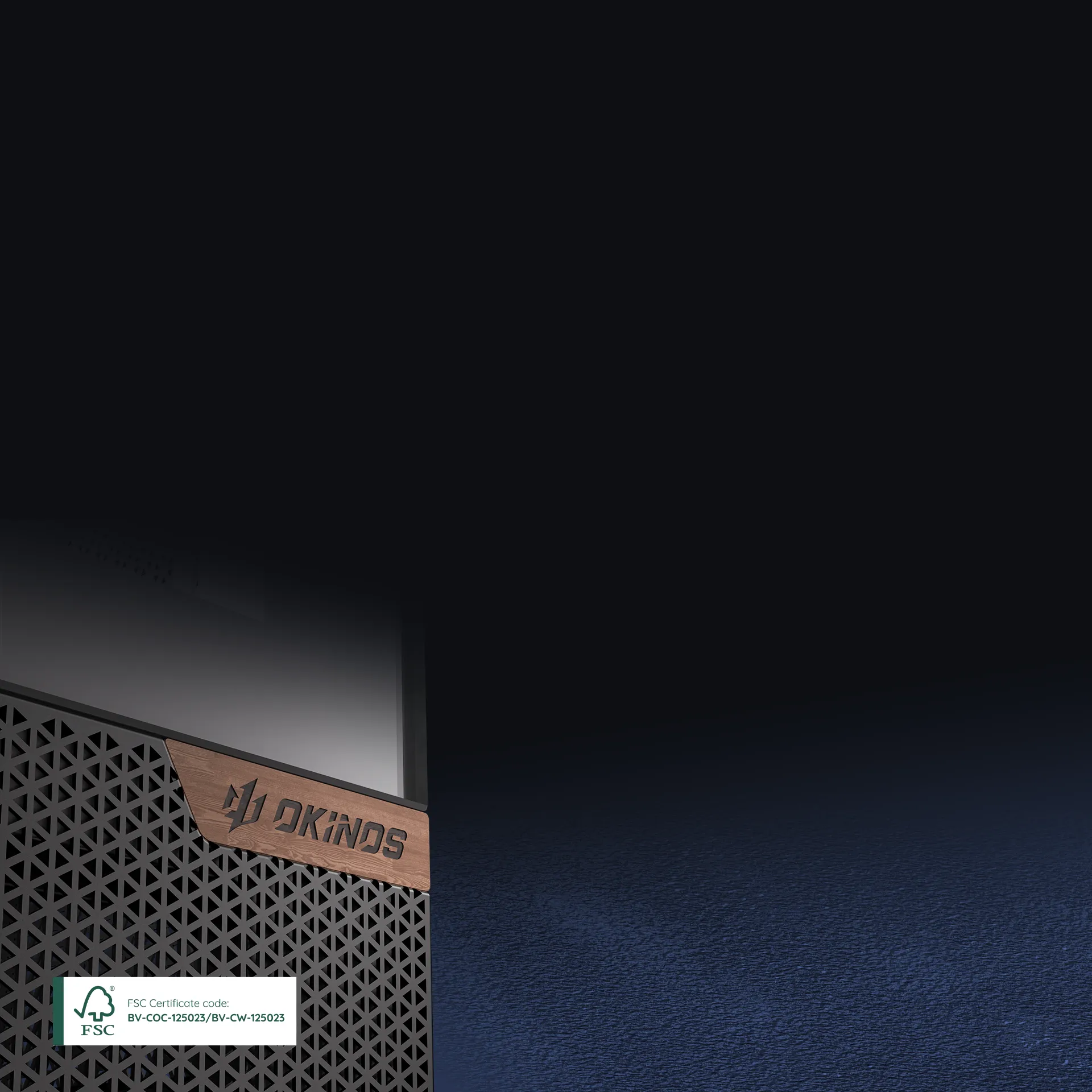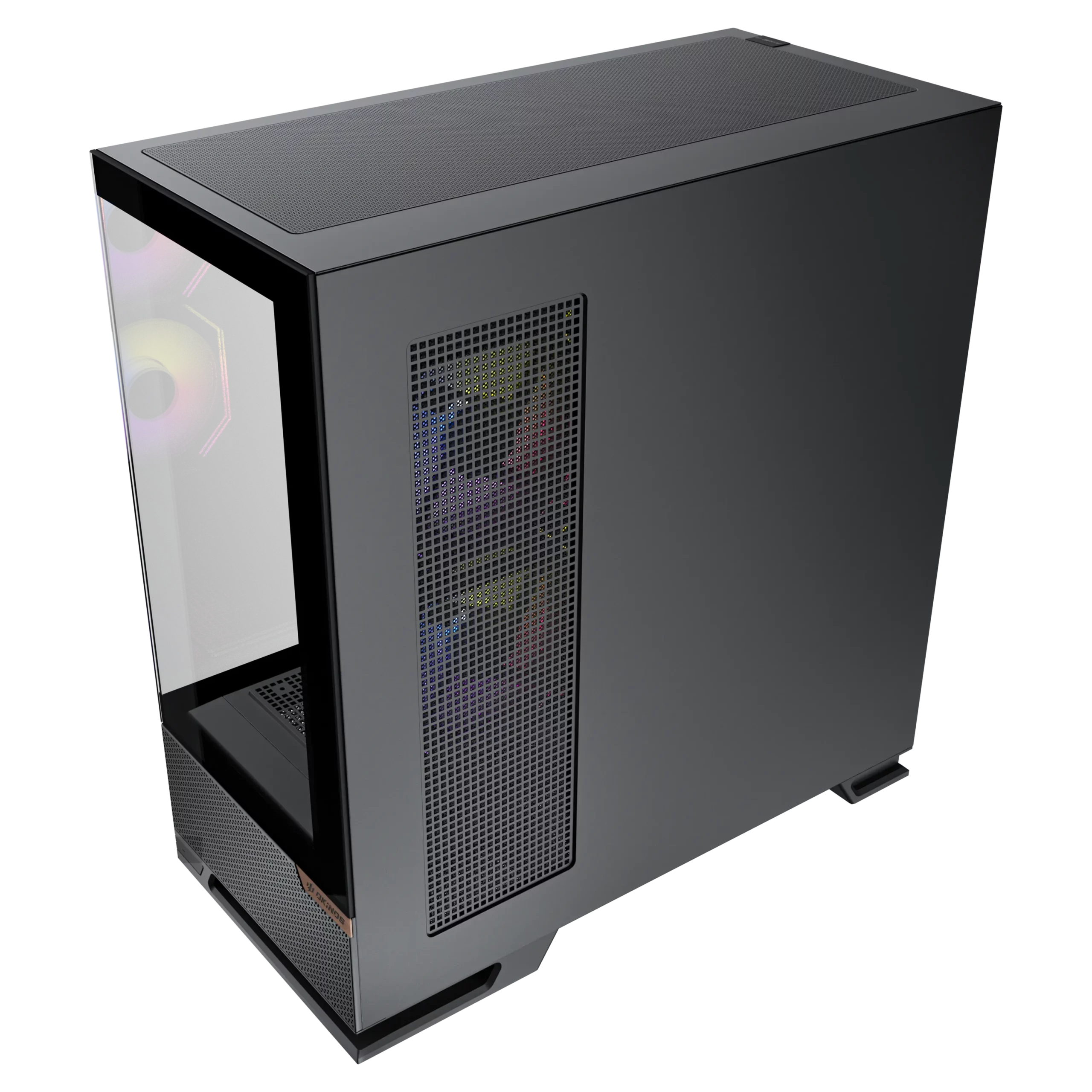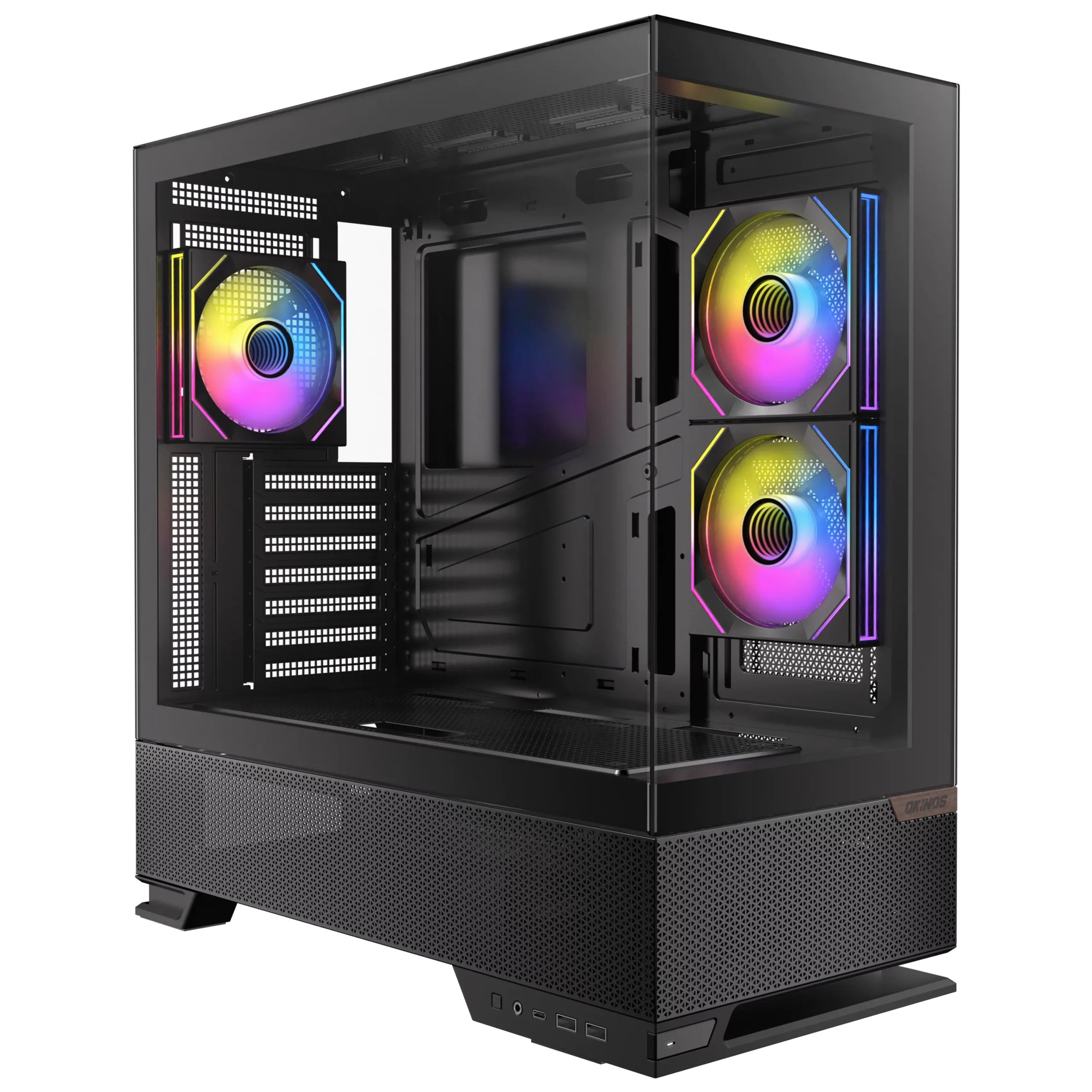 - Panoramic 270° view design with a floating case stand and a walnut wood badge on the front, offering exceptional airflow and a refined fusion of modern elegance.