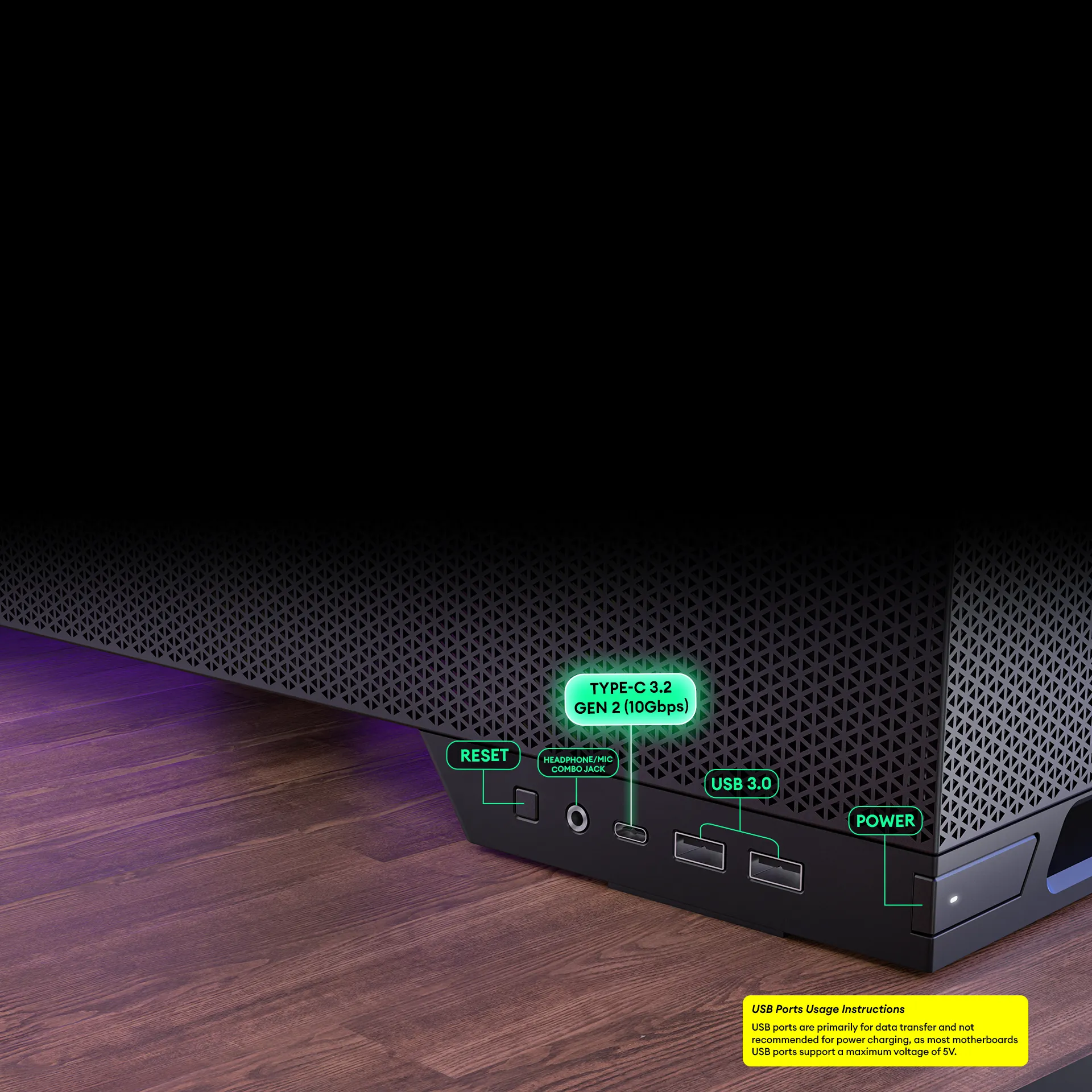 Power, Reset, USB3.0 x 2, Type-C 3.2 Gen 2 (10Gbps)x 1, Headphone/Mic Combo Jack