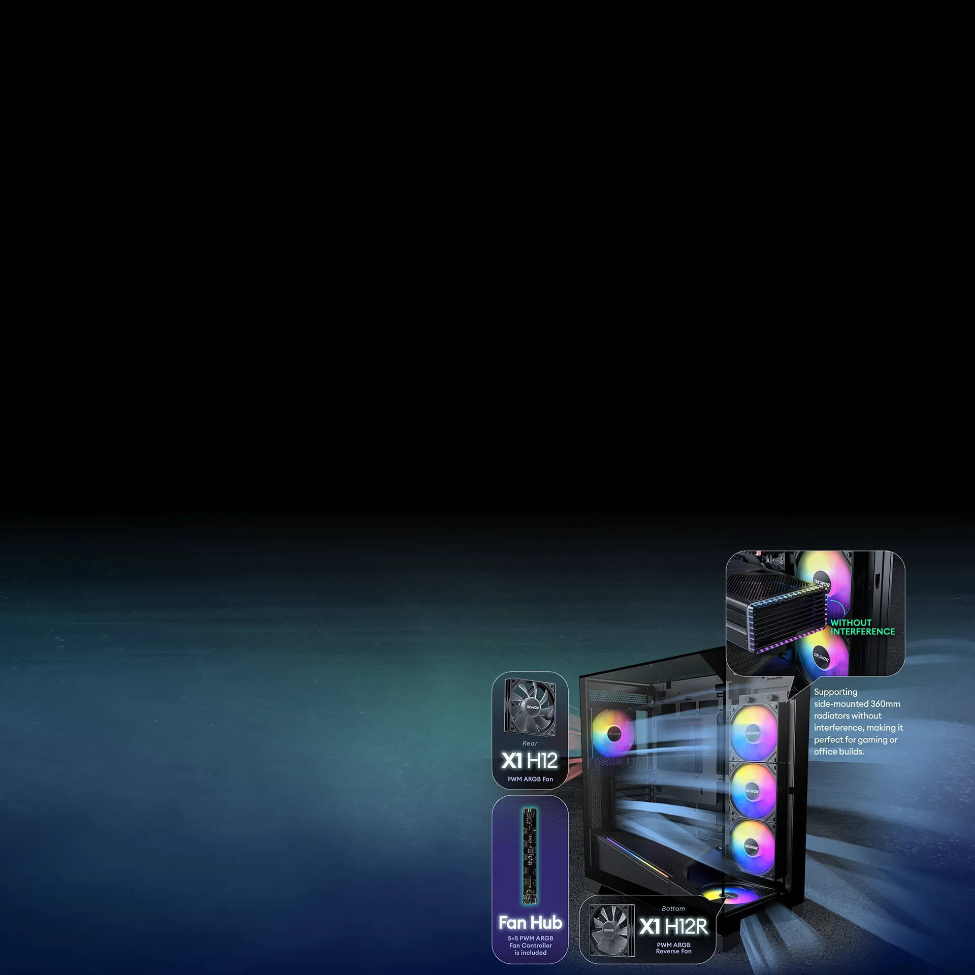 1 x 120mm ARGB PWM reverse fan on bottom + 1 x 120mm ARGB PWM fan in rear + 5-port ARGB PWM fan controller
