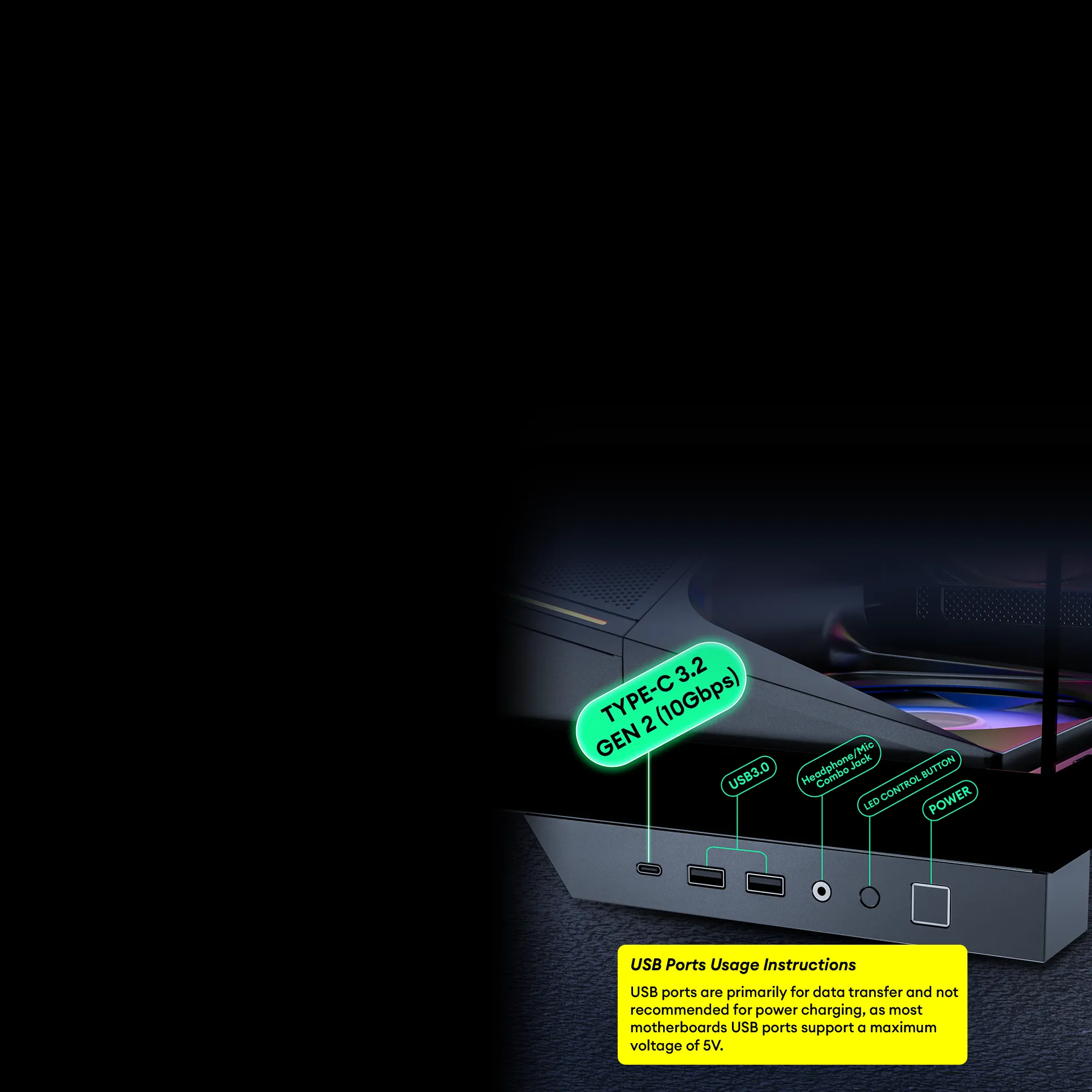 Power, LED Control Button, USB3.0 x 2, Type-C 3.2 Gen 2 (10Gbps)x 1, Headphone/Mic Combo Jack