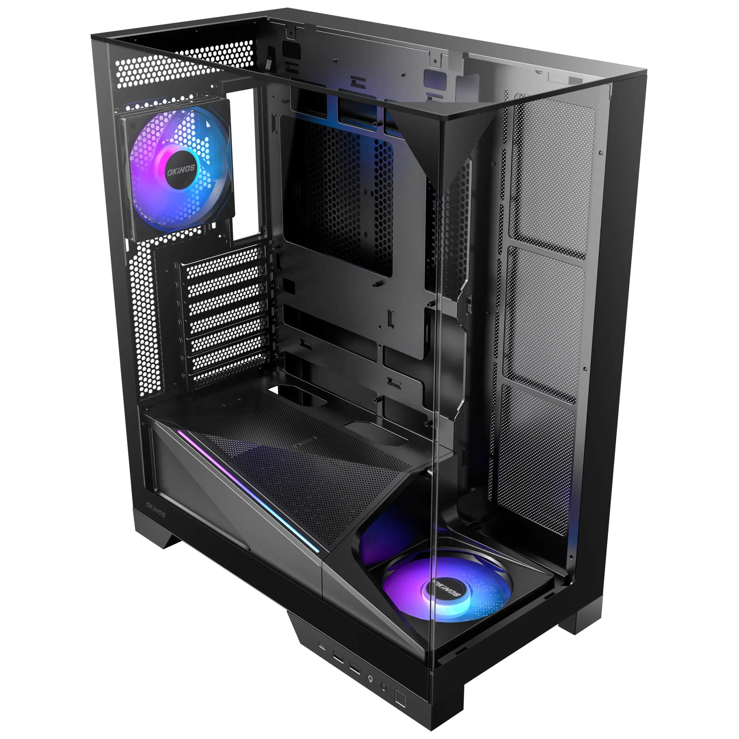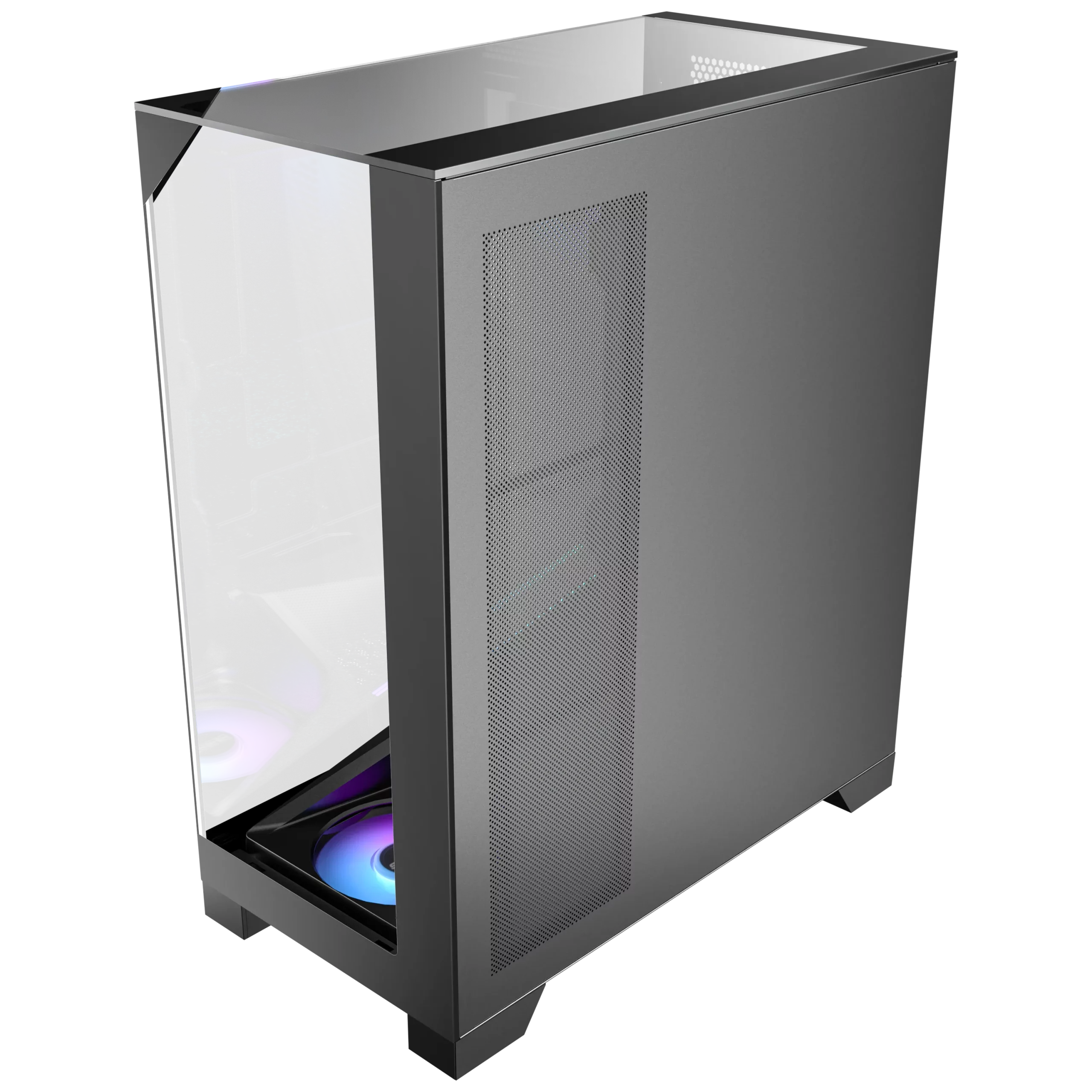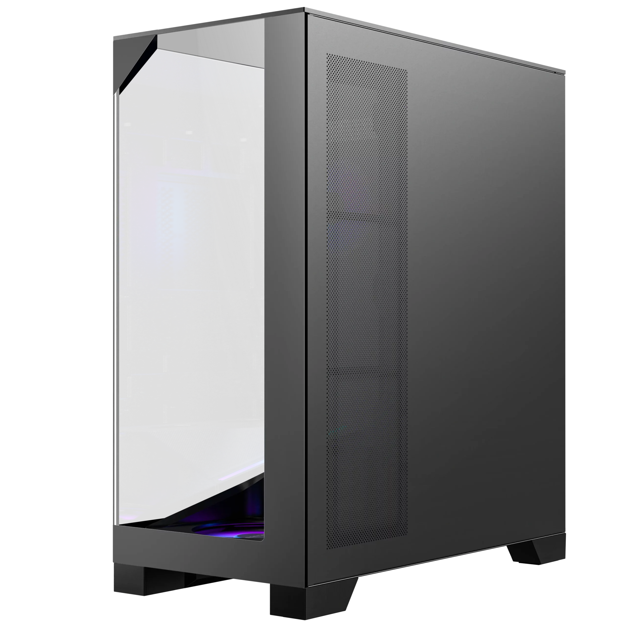 Panoramic three-sided tempered glass with a unique power supply shroud for a dynamic gaming setup.